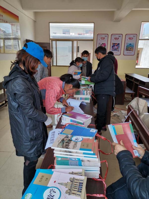 按照会议安排,学校干部职工分成12个组,安排20辆,运送教材下村发放。“抗击疫情,教材进村”活动提前通过微信群、电话通知等方式通知学生教材发放的时间地点,提前按年级将教材分好类别,提前对接村委会协助教材发放工作。“三提前”保障了教材发放工作的有序开展,大家齐心合力、共克时艰,一天的时间教材发放工作圆满结束。疫情终将结束,学生们将很快回到课堂,书声琅琅的校园将重新焕发生机!