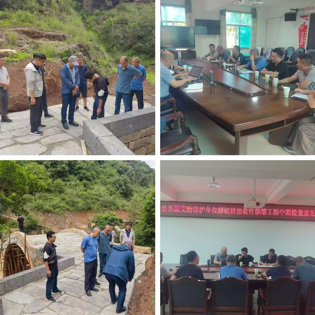 检查中,各方人员深入施工现场,对工程进度、施工质量以及文物保护措施等落实情况进行了细致查看。施工单位、监理单位详细汇报了工程进展及监管情况,目前各项工作正按计划有序推进;随后,专家组对修缮过程中涉及文物保护的关键环节提出了宝贵意见,并强调在施工中务必最大程度保留蟒蛇桥的历史风貌与原有建筑结构。