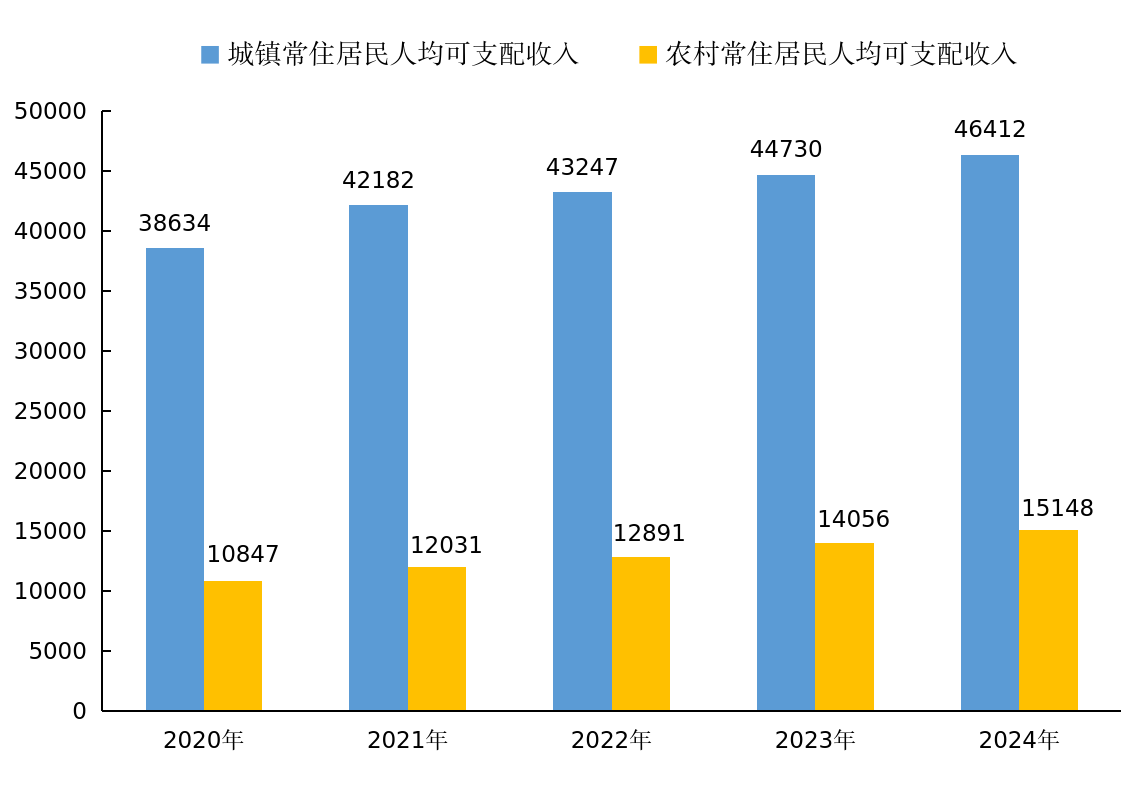 据抽样调查资料显示,全体居民人均可支配收入23277元,比上年增长5.7%;城镇常住居民人均可支配收入46412元,比上年增长3.8%(现价),人均消费支出36833元,比上年增长5.0%;农村常住居民人均可支配收入为15148元,比上年增长7.8%(现价),人均消费支出12465元,比上年增长6.0%。