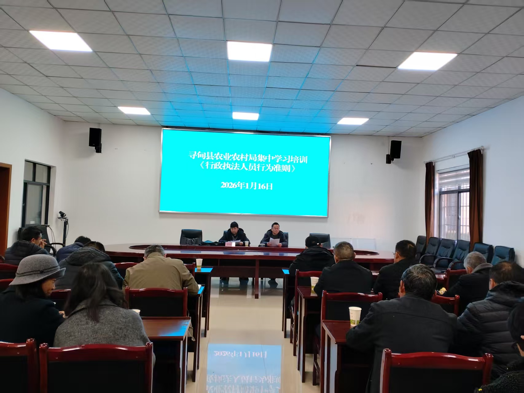 为深入学习贯彻习近平法治思想,落实司法部行政执法规范履职要求,强化农业执法队伍建设,提升执法规范化水平,2026年1月16日,寻甸县农业农村局组织执法人员集中学习司法部最新发布的《行政执法人员行为准则》,政策法规科、执法大队、植保植检站、动物卫生监督所等17个部门,共计70名执法人员参训。