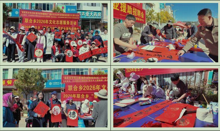 2.2 月 3 日,新春佳节来临之际,联合乡多部门联合开展 2026 年 “送春联・送祝福” 文化惠民活动,县书法家协会、联合中学及画室团队现场挥毫,为群众书写春联福字。武装部长朱会平、宣传委员王佳仙到场参与,活动现场墨香四溢、年味浓厚,村民踊跃参与,在喜庆氛围中感受传统文化魅力。此次活动以文化惠民为载体,弘扬优秀传统文化,铸牢中华民族共同体意识,进一步拉近党群干群关系,切实增强群众的幸福感、获得感。