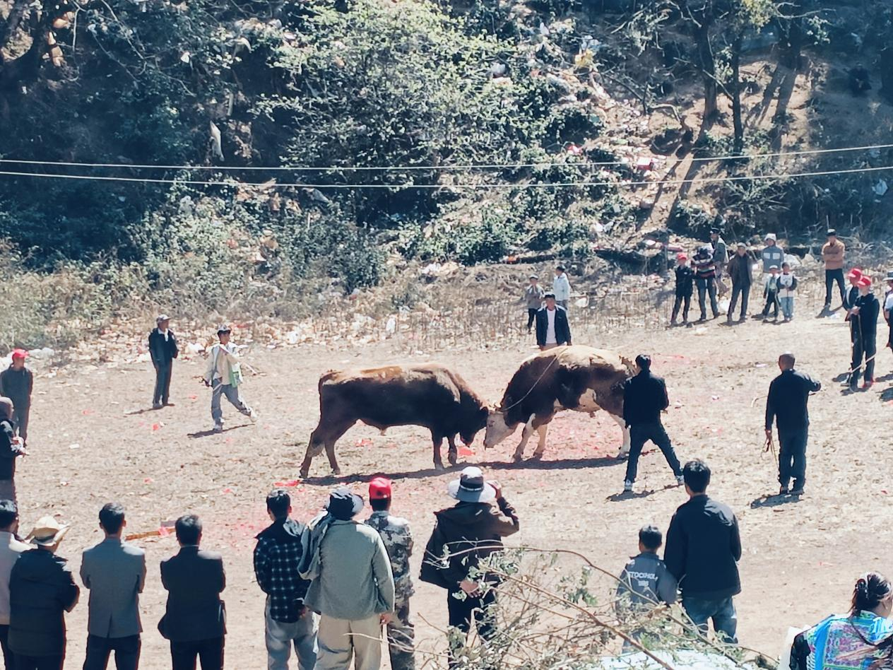 赛场上,竞技氛围火热爆棚。篮球赛场中,参赛队员们精神抖擞、配合默契,运球、传球、投篮一气呵成,每一次精彩得分都引来现场观众的阵阵欢呼;篮球赛结束后是舞蹈表演,村民们身着艳丽的彝族服饰,踏着欢快的节拍翩翩起舞,舞出对美好生活的无限向往;斗牛环节将新春的节日氛围推向高潮,紧张刺激的角逐让观众目不转睛,呐喊助威声不绝于耳。