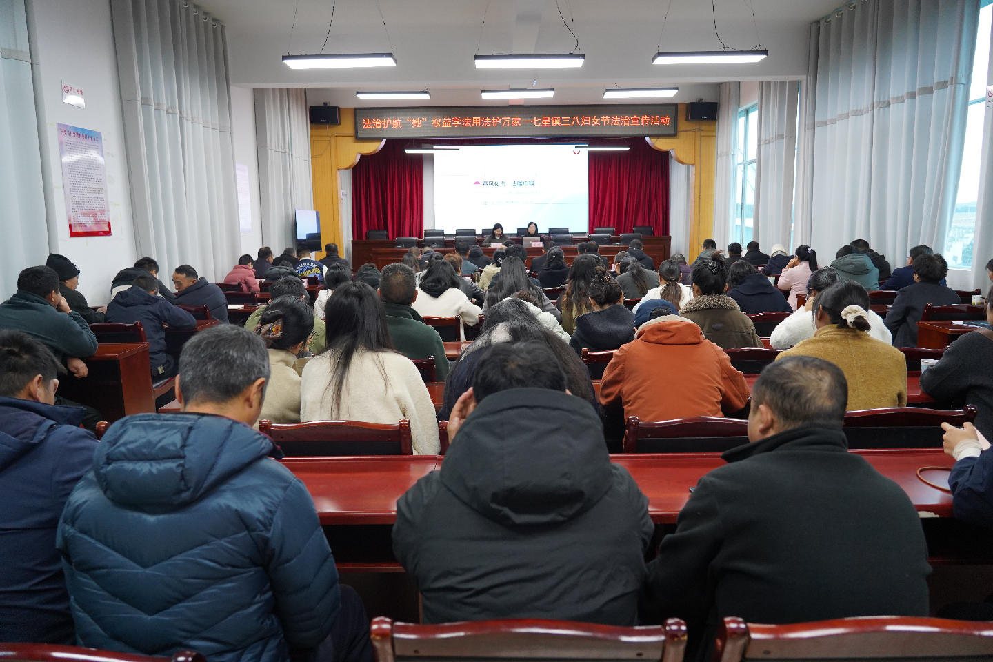 ★3月9日,七星镇开展三八妇女节法治宣传活动。活动邀请上海景天城昆明律师事务所毛硕律师开展妇女权益及民法典普法宣讲。会议由党委委员、组织委员杨秀兰主持。党政班子成员、各岗位负责人、各村党组织书记、主任、各基层妇联组织负责人、全体干部职工参加。