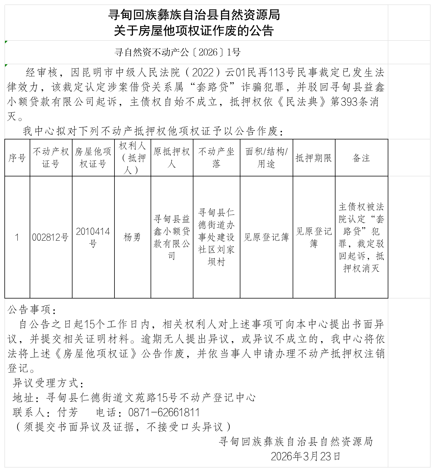 寻甸回族彝族自治县自然资源局关于房屋他项权证作废的公告(2026年1号)