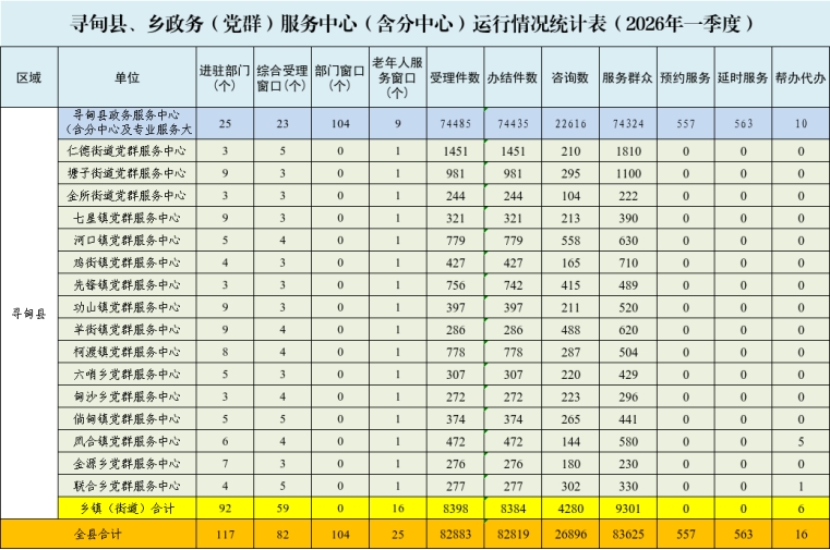 2026年一季度,寻甸县政务服务中心(含分中心)、党群服务中心共接件82883件,办结82819件,接待群众约83625人。其中:县政务服务中心(含分中心)大厅接件74485件,办结74435件,接待群众约74324人;乡镇(街道)党群服务中心接件8398件,办结8384件,接待群众约9301人。