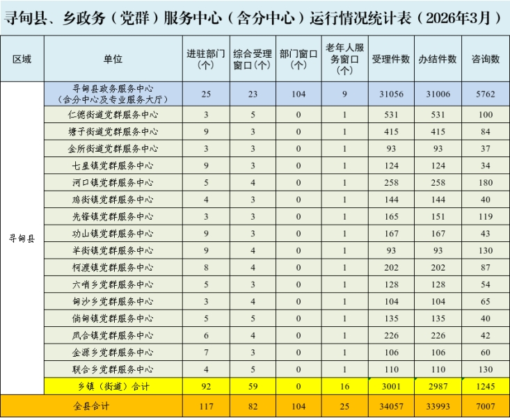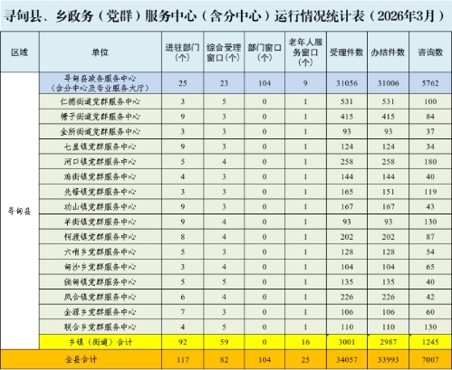 2026年3月,寻甸县政务服务中心(含分中心及专业服务大厅)、党群服务中心共接件34057,办结33993件,接待群众约36485人。其中:县政务服务中心(含分中心及专业服务大厅)大厅接件31056件,办结31006件,接待群众约33315人;乡镇(街道)党群服务中心接件3001件,办结2987件,接待群众约3170人。